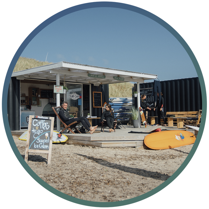 Lige bag klitterne ved Vesterhavet i Hvide Sande ligger WestWind Surf Café – kun et stenkast fra de fantastiske bølger, der rammer den danske Vestkyst. Dette spot er ofte vores foretrukne, når havet leverer bølger, som vores campdeltagere bare må opleve. Her kan du også nyde friskristet kaffe fra Risteriet i København og lækker Premier is.