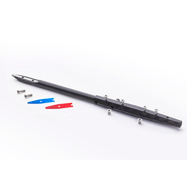 The A+ System Titanium Core (TC) fuselage is true work of hydrofoil art. At the design's heart lies a titanium rod core finely wrapped in machined carbon fiber. The front foil attachment is via a hexagonally shaped portion of the fuselage that's provides a naturally snug and secure fit even before hardware is added. The stabilizer is attached via a cutaway section that accepts our form-fitting Polycarbonate Pro Shims. The TC fuselage design is perfectly adapted to the diverse loads of different front foil types, and the design is futureproofed so that Armstrong foils from all years can fit right on.