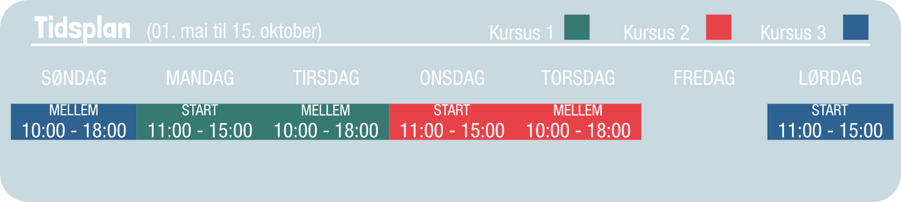 Bemærk: Tidsplanen kan ændres afhængigt af vejrforhold. Hvis vejret ikke tillader træning på vandet, vil vi i stedet tilbyde 2 timers teori på land, og resten af kursusgebyret refunderes.